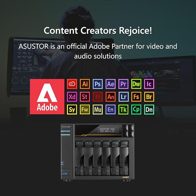 Asustor Lockerstor 6 Gen3 AS6806T 6 Bay NAS, AMD Ryzen Quad-Core 2.3GHz, 16GB ECC DDR5, 4 M.2 NVMe Slots, Dual 5GbE and 10GbE, Network Attached Storage for Video & Content Creator (Diskless)