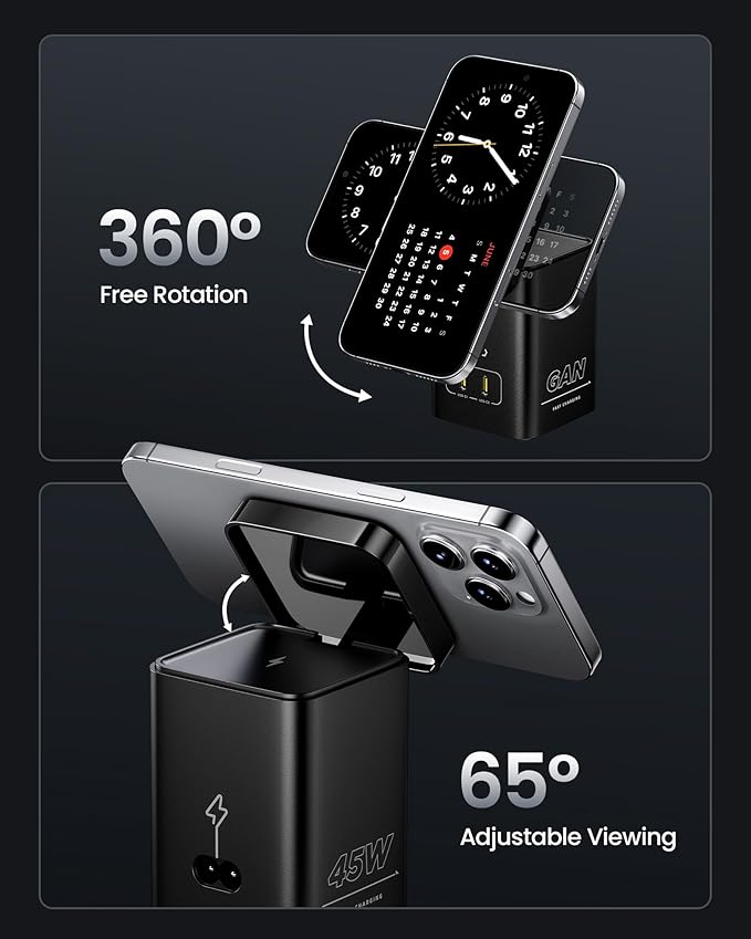 - [Adjustable Mag-Safe Charger Stand] Magnetic for iphone charger with foldable magnetic plate and can be freely folded up to 65°. Conveniently switch between landscape or portrait mode for a comfortable view.