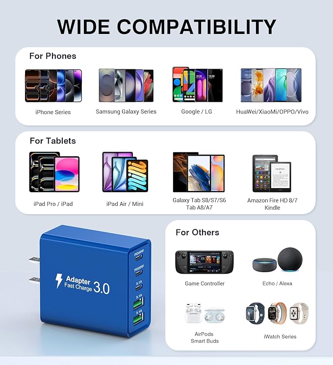 - Universal Compatibility:This type c charging block compatible with All smartphones and tablets, such as iPhone 17/17 Air/17 Pro/17 Pro Max/16/16 Pro/16 Plus/16 Pro Max/15/15 Pro/15 Plus/15 Pro Max/14/14 Pro/14 Pro Max/14 Plus/13/13 Pro/13 Pro Max/13 Mini/12/12 Pro/12 Pro Max/12 Mini/11/11 Pro/11 Pro Max/XS/XS Max/XR/X/8/8 Plus/7/7 Plus/6/6S/SE 2020, usb c charger for iPad Pro/Air/Mini, USB a Charger Compatible for Samsung Galaxy S25/S24/S23/S22/S21/S20/S10/S9/S7/A12/A13/A22/A32/A52/A53/Note 20 10/Z Fold 3, LG, Google Pixel, Kindle, Wireless charger, Tablets, Switch, etc