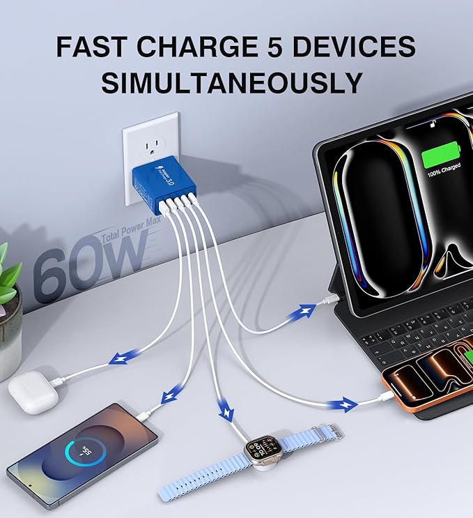 - USB Wall Charger Multiport:New Upgraded Design - ONE CHARGER BLOCK with 3 USB-C ports and 2 USB-A ports.Allow users to charge their phones, tablets, cameras, power banks, And when you connect 5 devices,power will be distributed efficiently between ports to ensure you get the best charge to minimize waiting time.It also saves a lot of space instead of occupying 5 wall sockets. It is the best replacement for your original USB charger