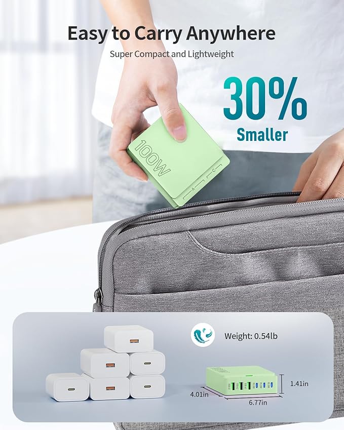 - 【Fast Charging】This product features 3 Type-C ports and 3 USB-A ports, with a total power of 100W. Only the Type-C ports support fast charging (max 20W per port), while USB-A ports do not (max 15W per port). Fast charging is limited to smartphones and tablets; older models may not be compatible, so check your device’s specifications first. A certified fast-charging cable is also required for fast charging with compatible devices.