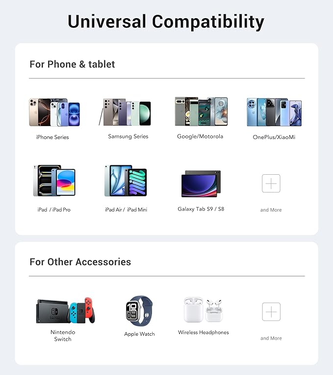 - Universal Compatibility Wall Plug:Due to the special 5-port,the USB charger is compatible with almost all electronic devices,charging adapter for iPhone 17/17 Pro/17 Pro Max/17 Air/16/16 Pro/16 Pro Max/15 Plus/15/15 Pro/15 Pro Max/14/14 Pro/14 Pro Max/13/13 Mini/13 Pro Max/12/12 Pro Max/12 Pro Max/12 Mini/SE 2020/11/11 Pro/11 Pro Max/XR/XS/X,iPad Air/Pro/Mini,Samsung Galaxy S22/S21/S20/S10/S9/S8/A12/A13/A22/A32/A52/A53/A71/Note 20 10,Tablets,LG,Google Pixel and other digital devices compatible.