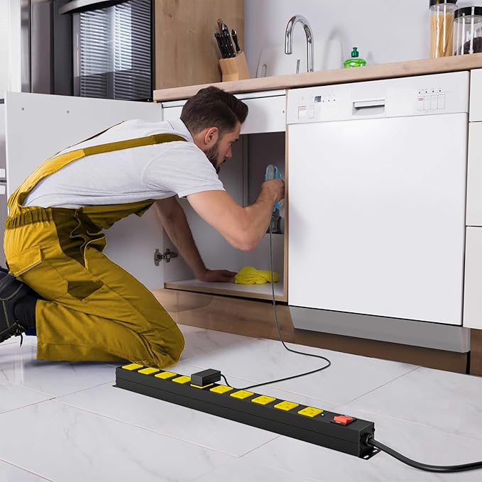 - Overload Protection with Illuminated Switch: Includes a big red button switch with light for easy operation. Maximum load 15A / 125V / 1875W / 60Hz. An automatic shut-off fuse is fitted inside for extra safety during use. If the current exceeds 15A, the power strip will be shut down immediately to protect the electronic devices. And the disposable fuse ensures safety in workshop and workbench.