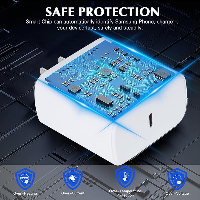 - [Fast Samsung Phone Charger Advanced Safety Features] Approved for USB-IF,UL-ETL-FCC-CE Certification and Strict Quality Control.Built in High-Tech Smart Chip and 56 Pull-Up Resistor Adjust Voltage & Current output to Match Connected Samsung Phone Devices and Design With Over-Voltage,Over-Current,Over-Heating,Short-Circuit Protection.The USB C Cable Built-in E-Mark Chipset can Automatically identify the Charge Current Required for Your Samsung Phone,Charge Your Device Fast,Safely and Steadily.